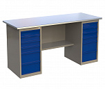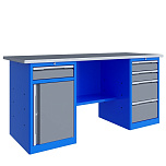 Двухтумбовый. Допустимая нагрузка на столешницу 1000 кг. Опорные элементы выполнены сварными из холоднокатаной стали. Для выполнения сборочных, ремонтных, слесарных, монтажных и других видов работ на производстве, в сервисных центрах, мастерских, гаражах, а также для обучения технологии в учебных заведениях. Комплектуется полкой-стенкой, расположенной под столешницей для удобного размещения габаритного инструмента и оснастки. Размеры верстака: 855x1796x696 мм. Вес: 105 кг. Поставляется в 4 комплектациях на выбор.
