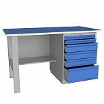 Верстак однотумбовый поставляется в разобранном виде. Нагрузка на столешницу до 600 кг. Стандартный цвет: корпус - серый глянец RAL 7030, ящики и двери тумб - синий RAL 5017. Размеры:855x1600x700 мм. Вес: 84 кг.