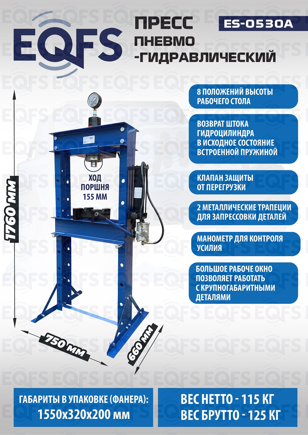 · Пресс укомплектован пневмогидравлическим и ручным насосом с максимальным усилием 30т.