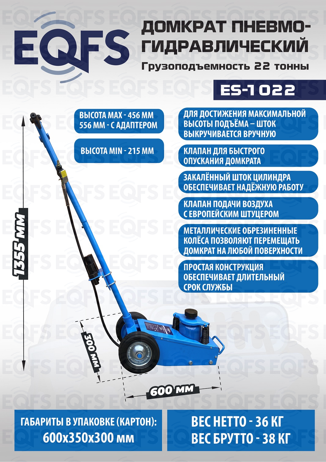 Технические особенности ES-1022 пневмогидравлический подкатной домкрат: