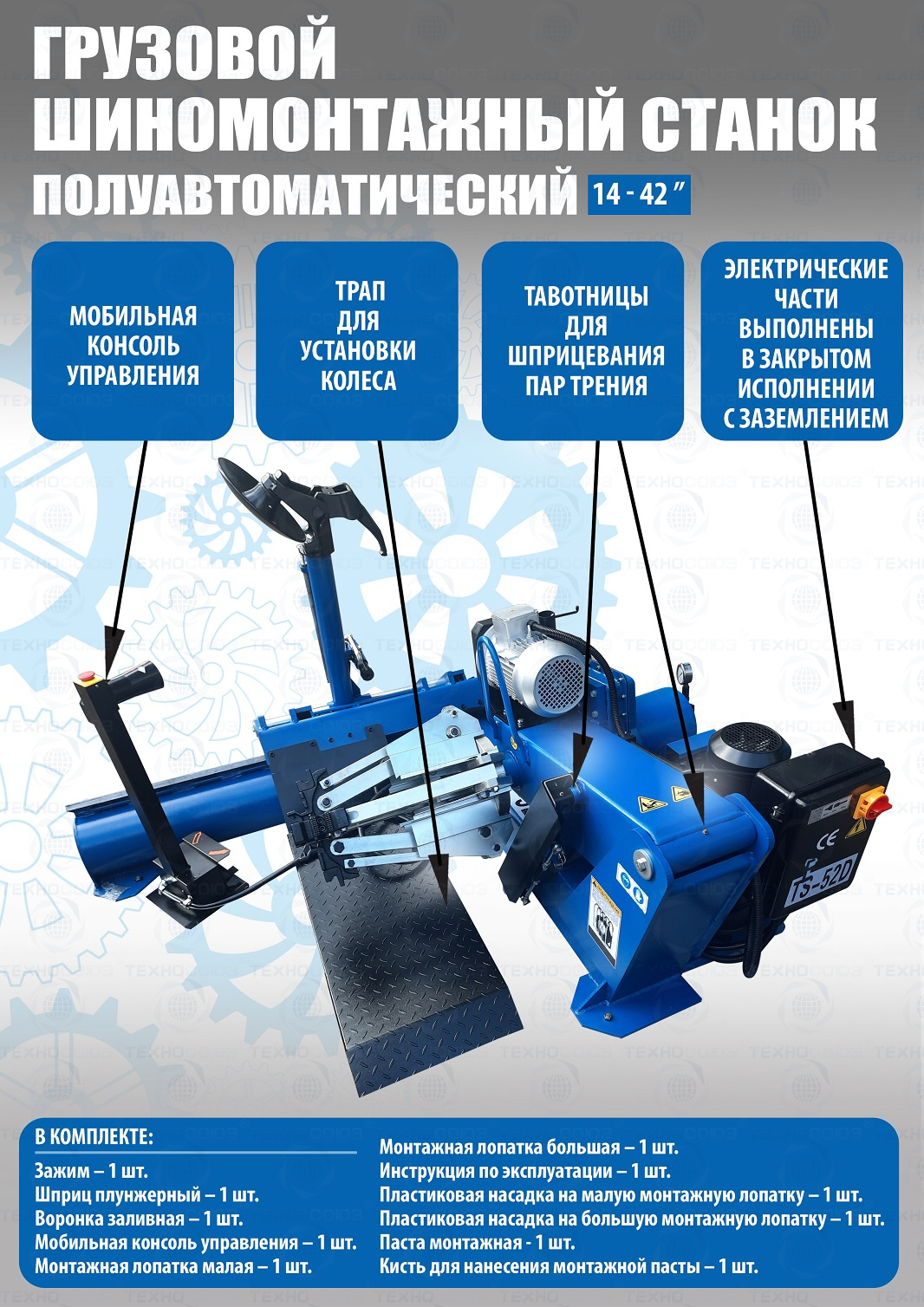 Комплект из TS-52D грузового шиномонтажного станка для дисков 14”-42”, с удлинителями на захваты до 52” - очень качественный станок. За последние 9 лет ни одной рекламации!!! Диски сталь + ALU Ø 14÷42” с адаптерами 14÷52”(опция). Автомат. Максимальное колесо Ø2300 ширина1050мм, вес до 1600кг. Моторы 2,2 + 2,2 кВт, 380В. Гарантия 12÷18мес. Гидронасос «BUCHER HIDRAULICS». Cтанок подходит для тракторов, сельхозтехники, еврофур и т.п. + ЛС-32 MAXY P Универсальный грузовой балансировочный станок для колес диаметром от 10 до 30 дюймов, имеет две программы для работы с легковыми и грузовыми колесами. Максимальный вес колеса до 200 кг. Оснащен функциями автокалибровки и самодиагностики.В стандартный комплект входит набор конусов для установки колес легковых автомобилей, микроавтобусов и легковых грузовиков типа "Газель", а также универсальный адаптер для установки колес большинства типов грузовых автомобилей. Для установки тяжелых колес ЛС 32 MAXIP комплектуется подкатной тележкой с пневматическим подъемным механизмом. Внесен в реестр средств измерений России Казахстана и Респ. Беларусь