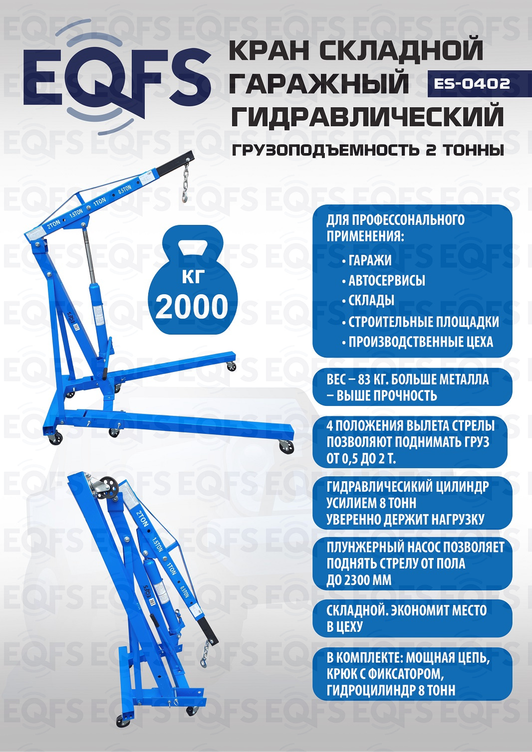 Для профессионального применения. Вес: 83 кг. Складной. Грузоподъемность 2т. Рабочий диапазон стрелы 1030-1580 мм. Высота подъёма крана от пола цеха – 170÷2300 мм. Вес: 83 кг. Для подъема и транспортировки автомобильных узлов, агрегатов и любых других грузов как внутри помещения, так и на улице. Вынос стрелы регулируется в соответствии с максимальной грузоподъемностью крана – 500-1000-1500-2000кг. Рабочим приводом крана является гидроцилиндр. Устройство полностью автономно, не требует дополнительных конструкций. Цвет темно-синий.