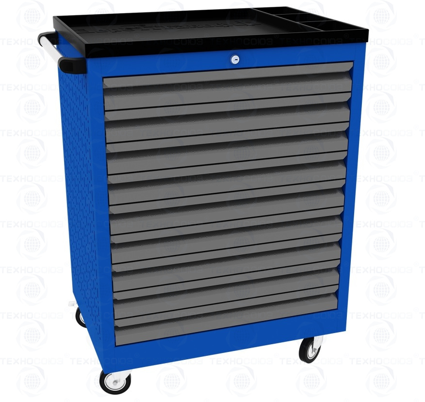 Тележки инструментальные серии PROFFI 950 предназначены для использования на предприятиях любого профиля занятых ремонтом и изготовлением различной продукции. На боковые стенки инструментальной тележки нанесена перфорация размером 25х25 мм и диаметром отверстия 8 мм, что позволяет устанавливать на них навесной инструмент или крючки. Наибольшей популярностью тележки инструментальные пользуются в сфере авторемонта и обслуживания автомобилей .Тележки имеют выдвижные ящики на шариковых телескопических направляющих полного выдвижения с фиксацией в закрытом положении, предотвращающее открывание при передвижении тележки. Ящики имеют центральный замок, который позволяет ограничить доступ посторонних лиц к содержимому ящиков. Тележка инструментальная изготовлена из высококачественного металла ведущих Российских производителей, покрашена порошковой краской производства Германии, имеет итальянскую и турецкую фурнитуру. Тележки для инструмента оснащены двумя не поворотными колесами диаметром 100 мм, одним поворотным и одним поворотным со стопором, которое фиксирует тележку и предотвращает непроизвольное скатывание.